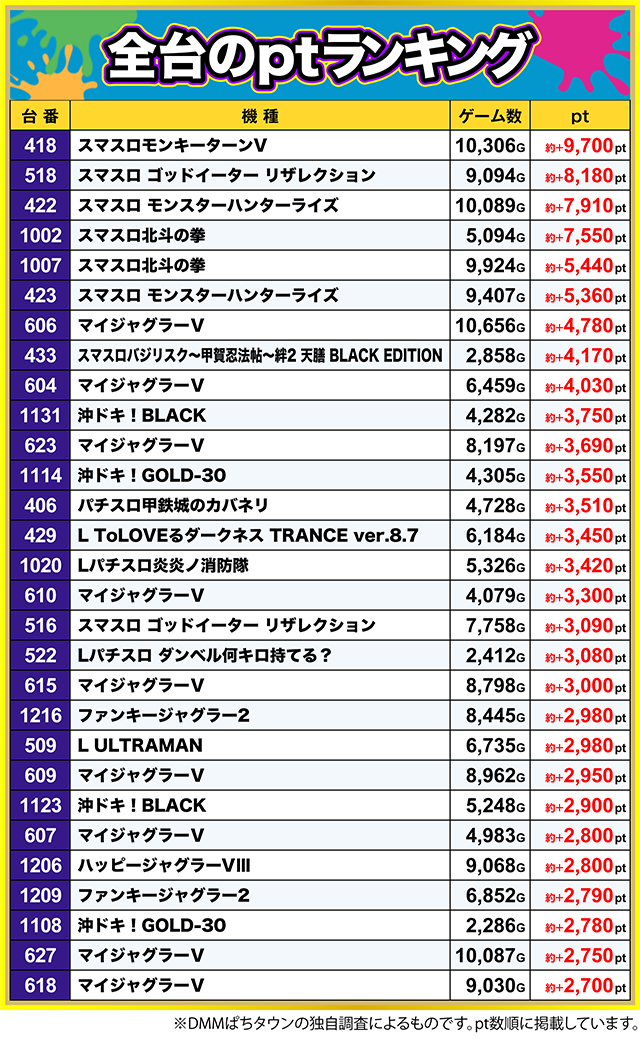 9台が約+1,100ptを超え、約+3,600ptを上回った台もアリ。