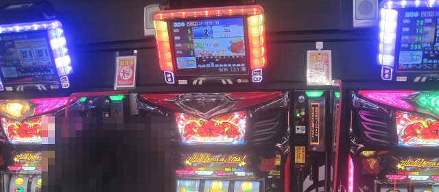 通路にドル箱別積みする台が見られ、『キングハナハナ-30』『スターハナハナ-30』『沖ドキ!GOLD-30』『ハナハナホウオウ~天翔~-30』いずれもボーナス回数の多さが目立った。
