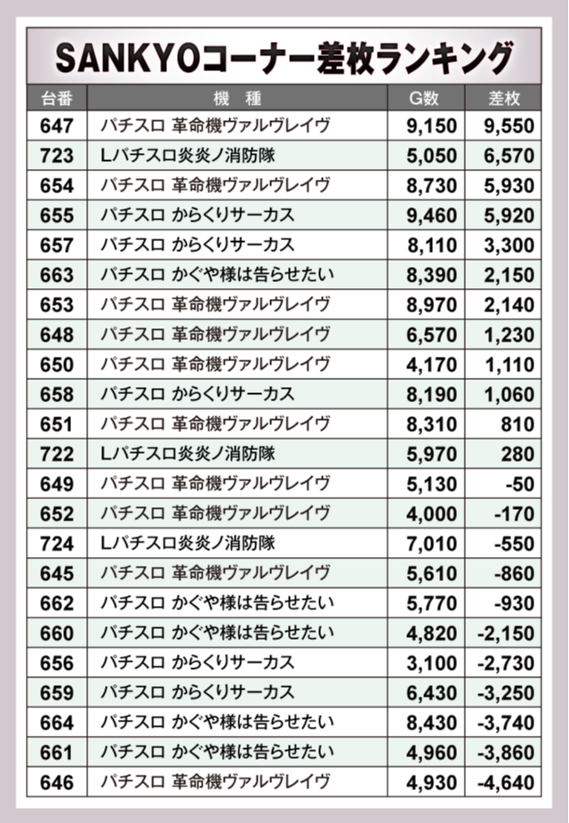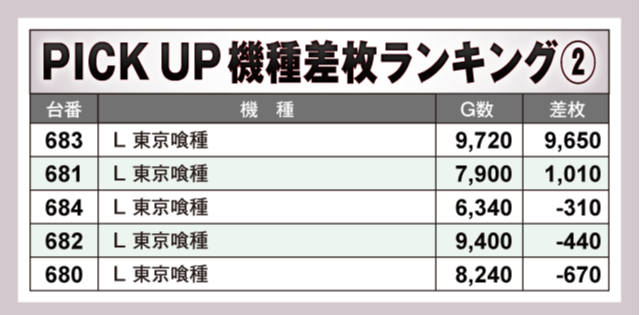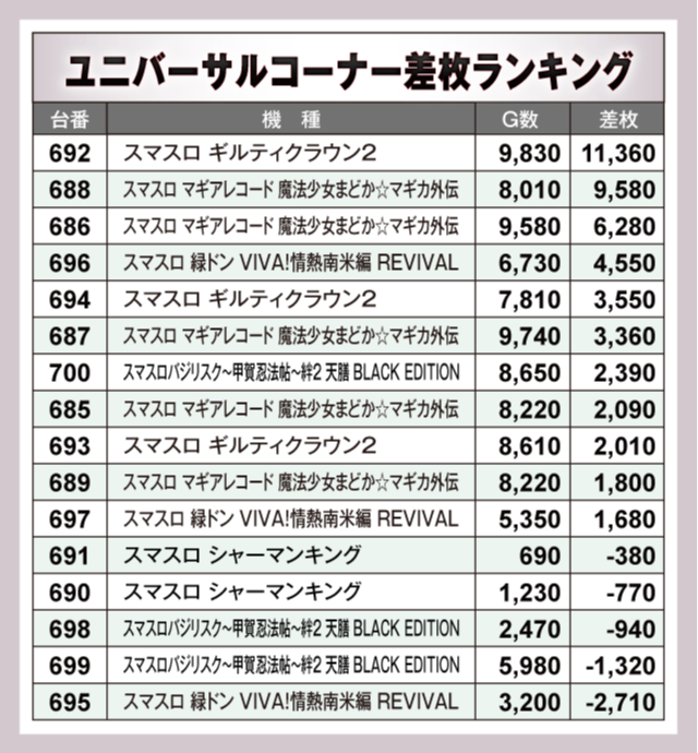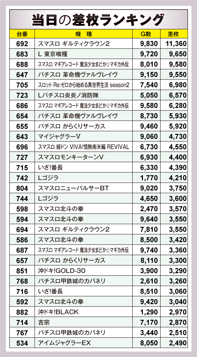 この日は、導入直後の新台『スマスロ ギルティクラウン2』が万枚超の+11,360枚を叩き出しランキングトップに。そのポテンシャルの高さを早くも披露しプレイヤーの注目を集めていた。次いで『L 東京喰種』と『スマスロ マギアレコード 魔法少女まどか☆マギカ外伝』、さらには『パチスロ 革命機ヴァルヴレイヴ』から+9,000枚超が飛び出している。