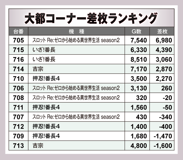 続いてPICK UP機種の状況をチェックしていこう。ユニバーサルコーナーでは万枚超を達成した『スマスロ ギルティクラウン2』を筆頭に全16台11台がプラス差枚となっている。また、大都コーナーからは『スロット Re:ゼロから始める異世界生活 season2』が+6,980枚を記録。そして、SANKYOコーナーで特に目立っていたのが『パチスロ 革命機ヴァルヴレイヴ』で、差枚TOP10に5台がランクインする勢いを見せていた。