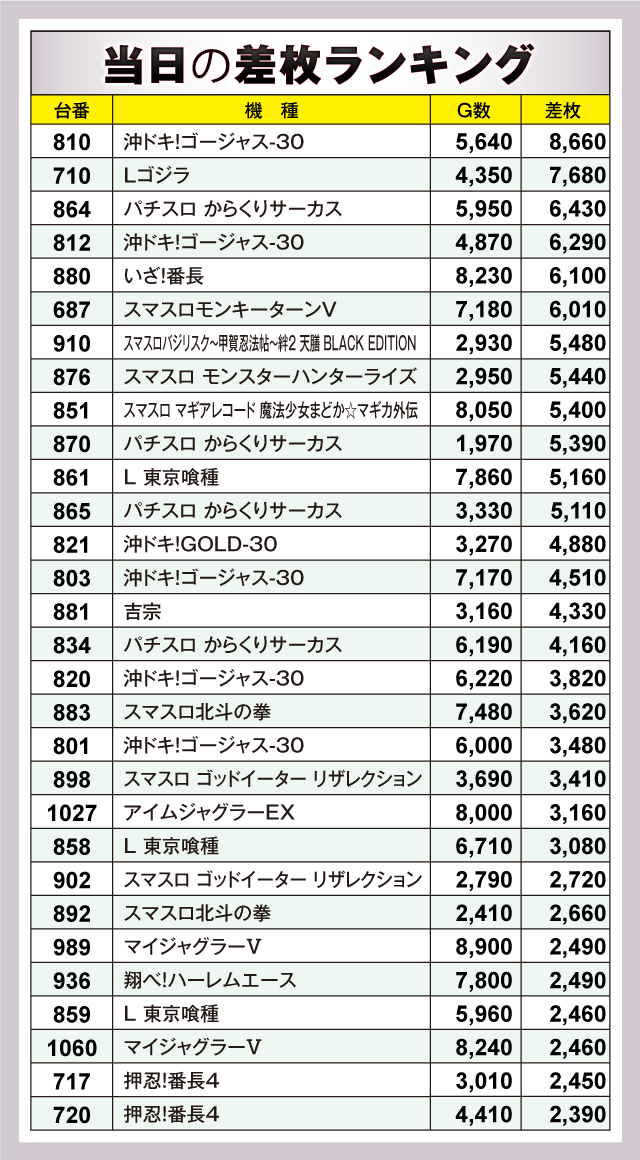 この日、最もプレイヤーの注目を集めたのが『沖ドキ!ゴージャス-30』で、810番台が+8,660枚を叩き出しランキングトップに。次いで『Lゴジラ』が+7,680枚、さらに『パチスロ からくりサーカス』や『いざ!番長』、『スマスロモンキーターンV』などから+6,000枚超が飛び出す盛況ぶりを見せファンを喜ばせていた。