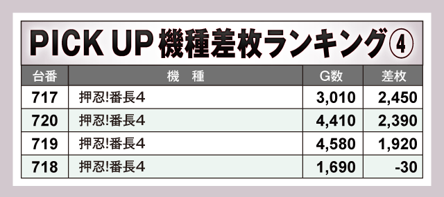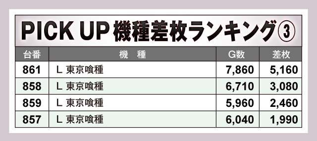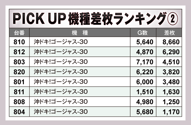 次にPICK UP機種の状況を見ていこう。ランキング上位台以外にも多数のハイスコアが確認されており、『パチスロ からくりサーカス』は+5,000枚超が2台、『沖ドキ!ゴージャス-30』が+6,290枚、『L 東京喰種』が+5,160枚を記録。また、『押忍!番長4』と『マイジャグラーⅤ』からはプラス差枚で実戦を終えている台が大量発生している。