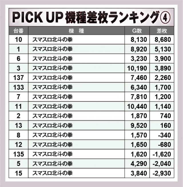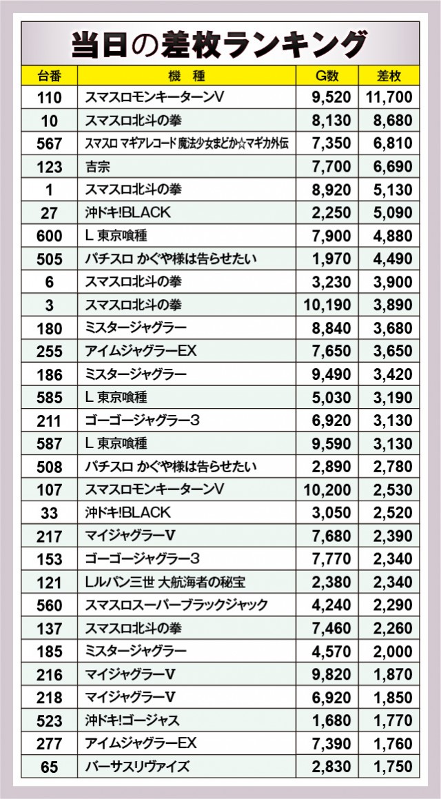 『スマスロ マギアレコード 魔法少女まどか☆マギカ外伝』『スマスロモンキーターンV』『L 東京喰種』はいずれも優秀機種として高いポテンシャルを秘めており、万枚&万回転や大台突破台が多数生まれている。半数以上でプラス差枚数を築いているという点も見逃せず、嬉々としてレバーを叩くファンの姿が容易に想像できるばかりだ。そして『スマスロ北斗の拳』は今回も活気と熱気に満ち、ファンを沸かせた機種として存在感を放っていた。