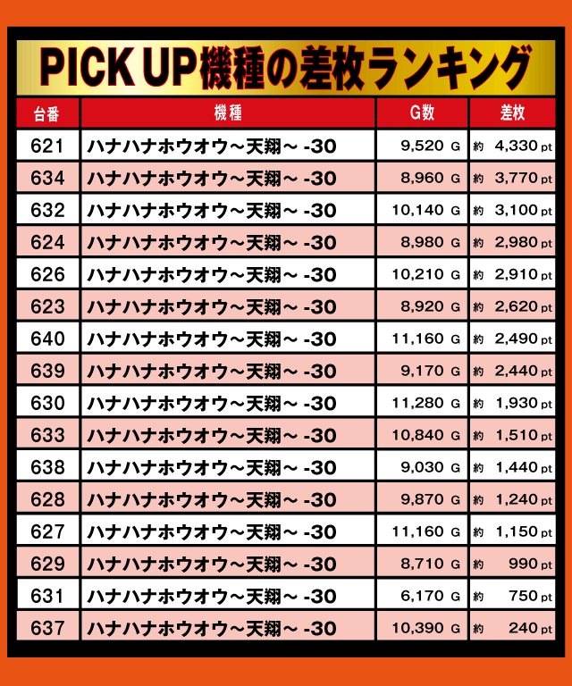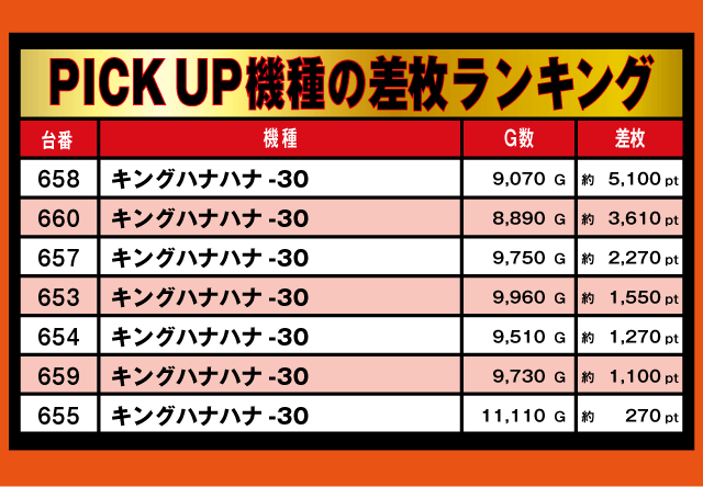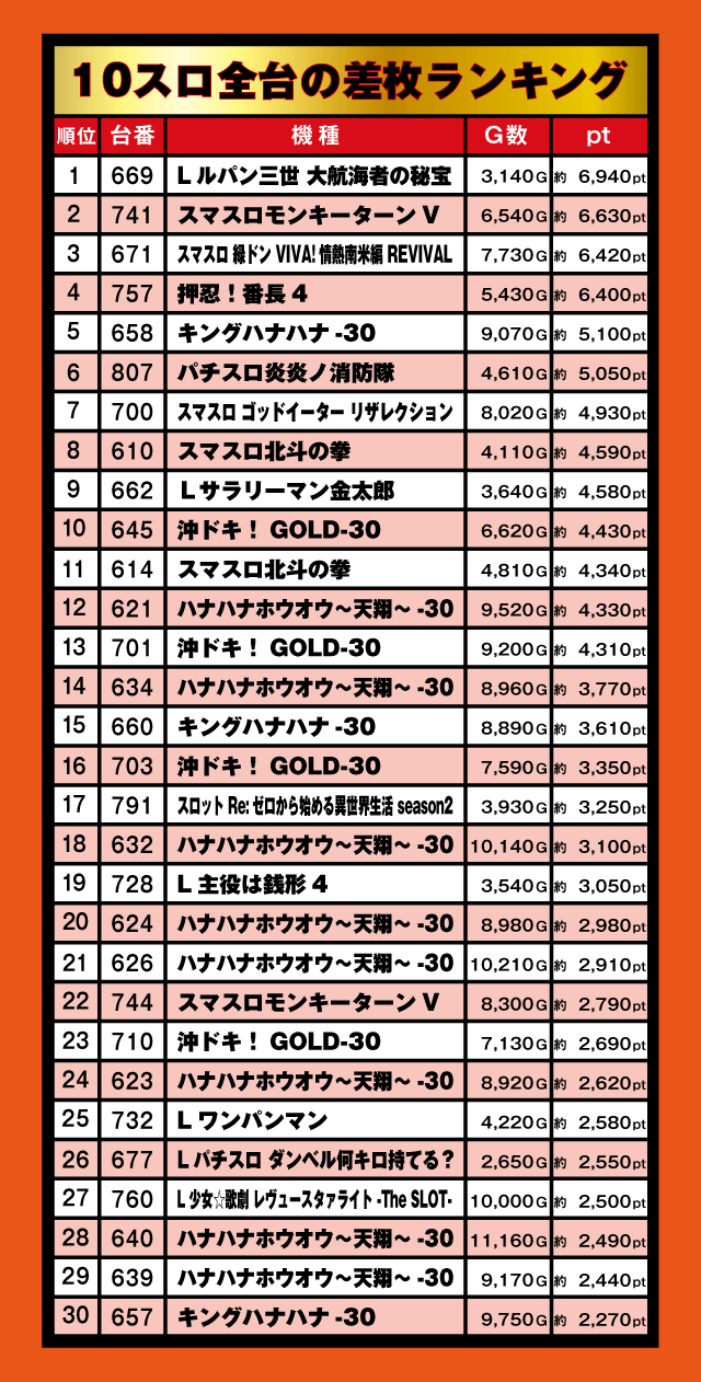 『沖ドキ!GOLD-30』は、G数が回された台ほど結果がついてきている印象。645番台が+4,430ptと見事な結果を残した。
