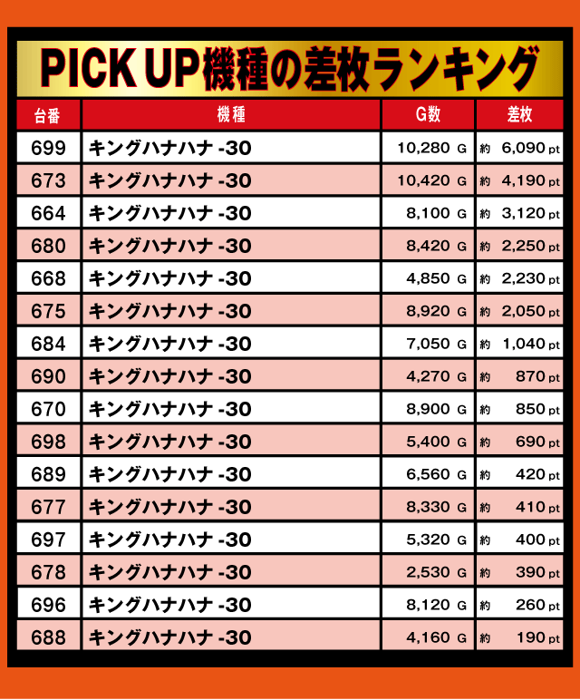 『キングハナハナ-30』は37台中16台がプラスpt。1万G回された699番台が+6,090pt、673番台が+4,190ptを叩きだしている。