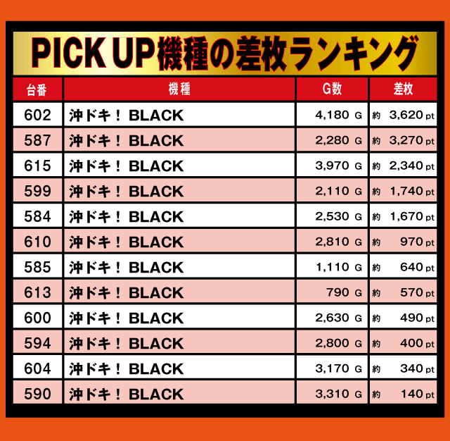 『沖ドキ!BLACK』は36台中12台がプラスで、4桁ptオーバー多数出現と華々しい成績だ。