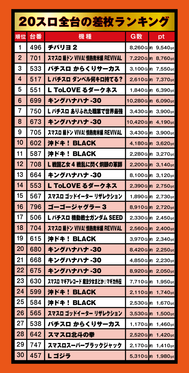 『チバリヨ2』496番台が1万pt目前の+9,540ptと素晴らしい結果を残した。続く『スマスロ 緑ドン VIVA!情熱南米編 REVIVAL』701番台が+8,760ptで、『パチスロ からくりサーカス』533番台が+7,550ptを獲得。