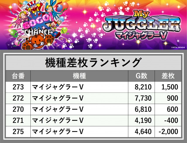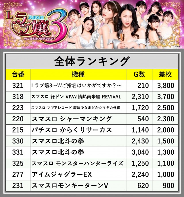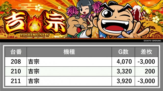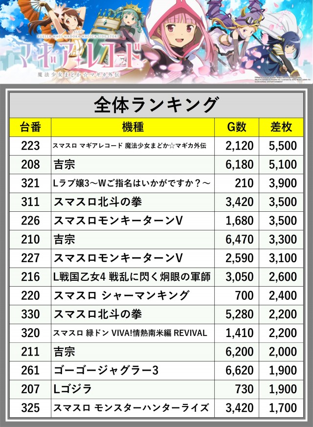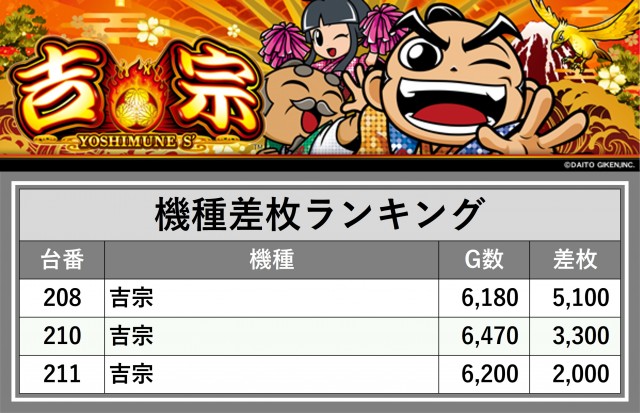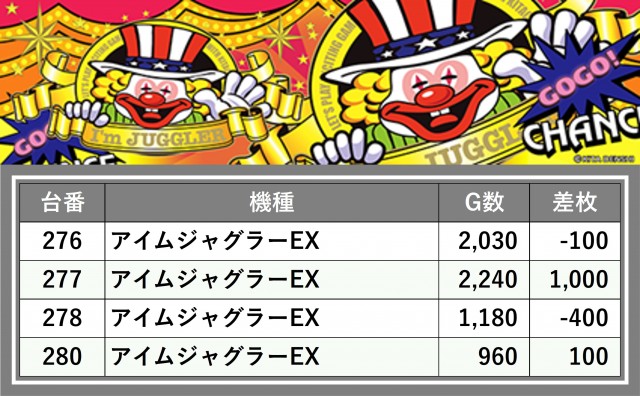 厳選された取材対象機種をはじめ、その他スロット全体から好記録が飛び出した!プレイヤーが楽しんだ1日を下記データにて振り返ってみて欲しい。