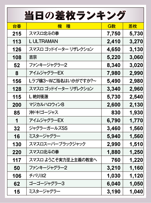 当日の差枚ランキングを見てみると、ランキング21台のうち10台が差枚+2,000枚オーバーを記録。それらのなかでもっとも優秀だったのは、215番台の「スマスロ北斗の拳」で差枚は+5,730枚をマーク! その他にも、スマスロからジャグラーシリーズまで多彩な機種がランクインしており、訪れたファンたちが存分に楽しめる環境が整っていたことが窺えた!