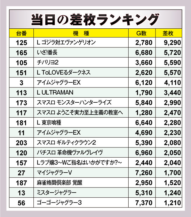 スロット全体差枚ランキングでは、全17台のうち13台が+2,000枚オーバーを記録し、+3,000枚オーバーは6台出現! それらのなかでもっとも活躍していたのは、125番台の「L ゴジラ対エヴァンゲリオン」で、差枚は+9,290枚を獲得! その他も多くの良台がランクインしており、とくにジャグラーシリーズは5台/17台がランクインするほど、シリーズ全体で盛り上がりを見せていた!