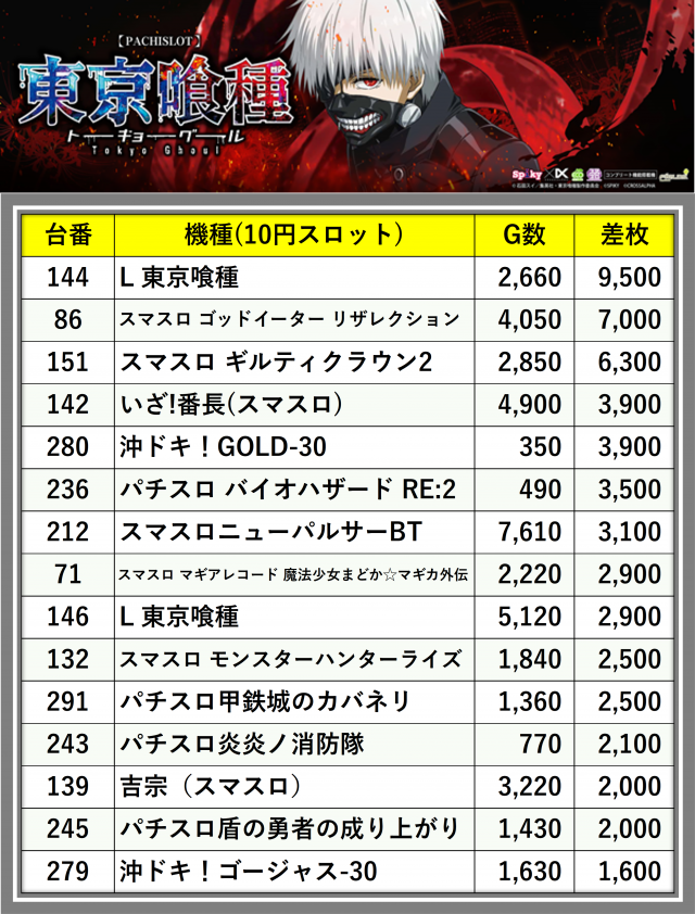 厳選された取材対象機種をはじめ、その他スロット全体から好記録が飛び出した!プレイヤーが楽しんだ1日を下記データにて振り返ってみて欲しい。
