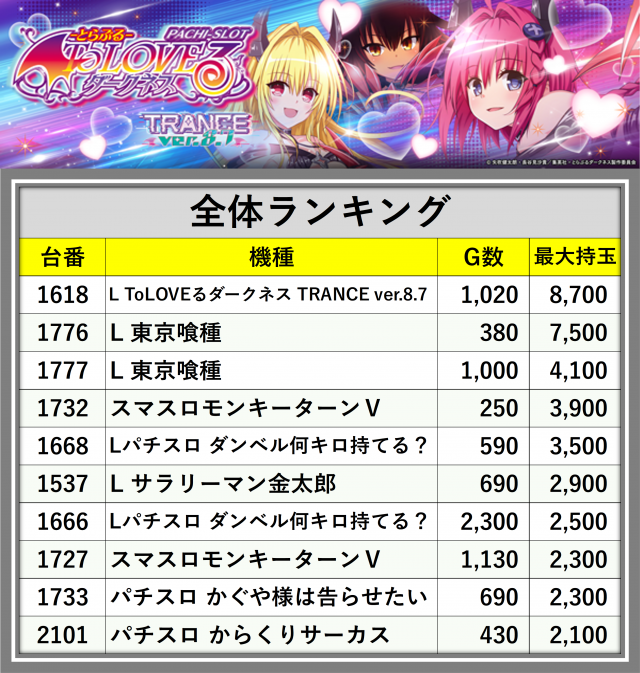厳選された取材対象機種をはじめ、その他スロット全体から好記録が飛び出した!プレイヤーが楽しんだ1日を下記データにて振り返ってみて欲しい。