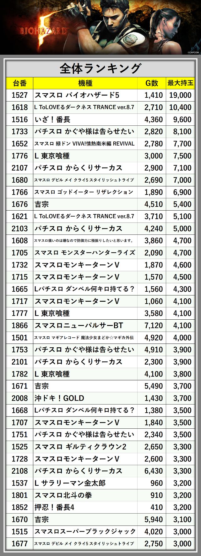 ※最大持玉数順に掲載しています