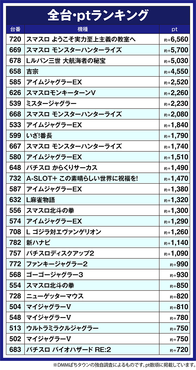 「ミスタージャグラー」の539番台も約+2,200pt以上と、ジャグラーシリーズの各機種もにぎわいをみせた。