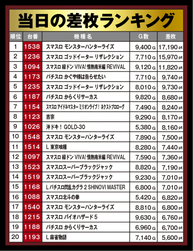 この日のSAPグループはひと味違う。DMMぱちタウンは、「SAP草加店」の特別なひとときを一斉取材した。特に華々しい活躍を残した機種たちをピックアップして紹介しよう。まずは差枚ランキングの発表だ!