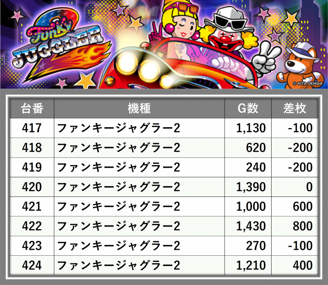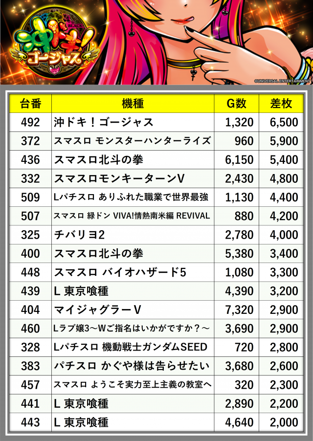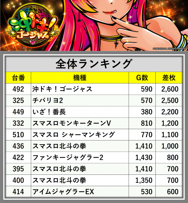 厳選された取材対象機種をはじめ、その他スロット全体から好記録が飛び出した!プレイヤーが楽しんだ1日を下記データにて振り返ってみて欲しい。