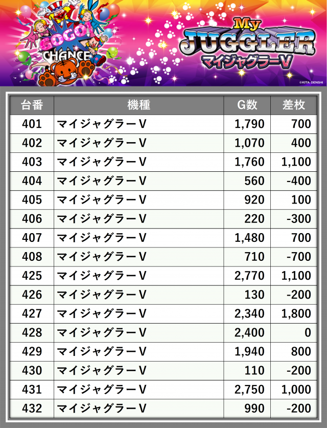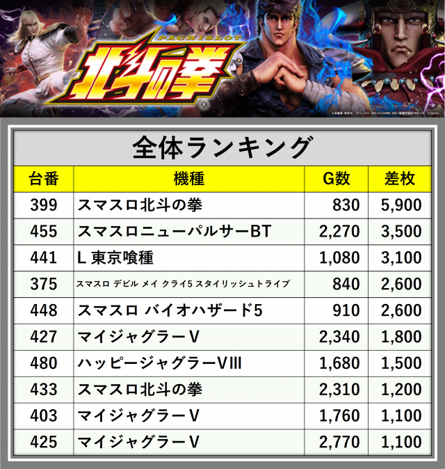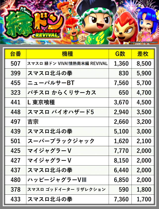 厳選された取材対象機種をはじめ、その他スロット全体から好記録が飛び出した!プレイヤーが楽しんだ1日を下記データにて振り返ってみて欲しい。