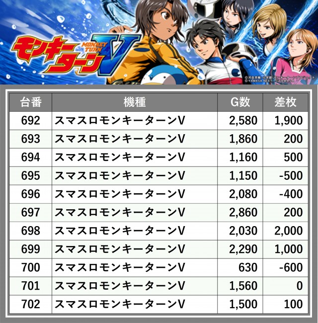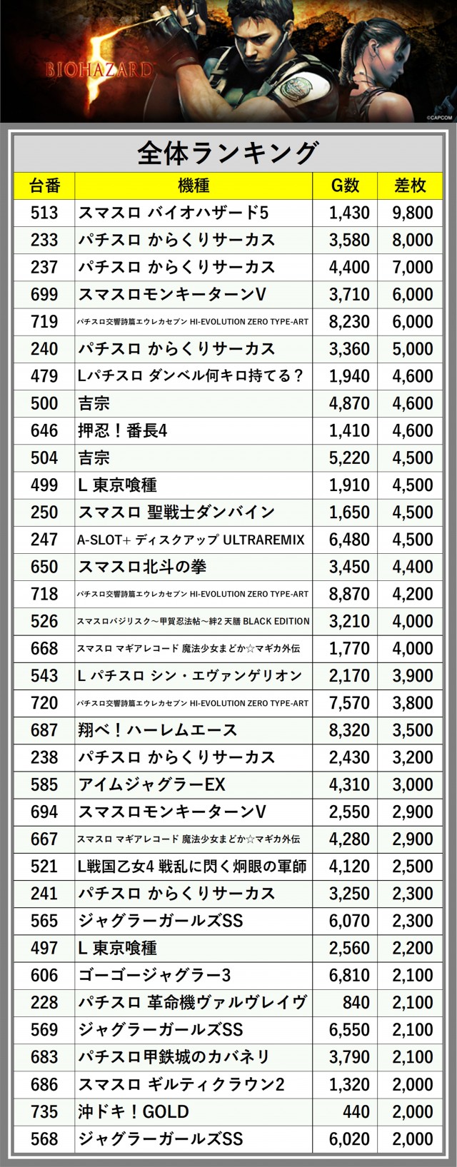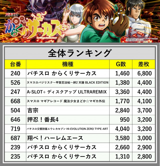 厳選された取材対象機種をはじめ、その他スロット全体から好記録が飛び出した!プレイヤーが楽しんだ1日を下記データにて振り返ってみて欲しい。