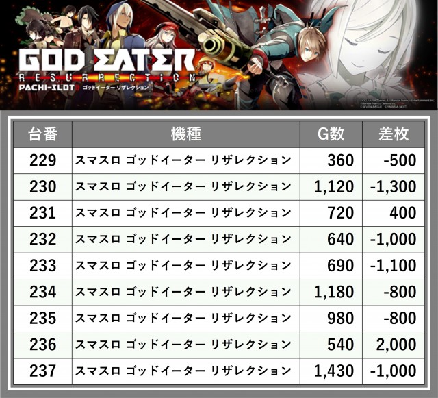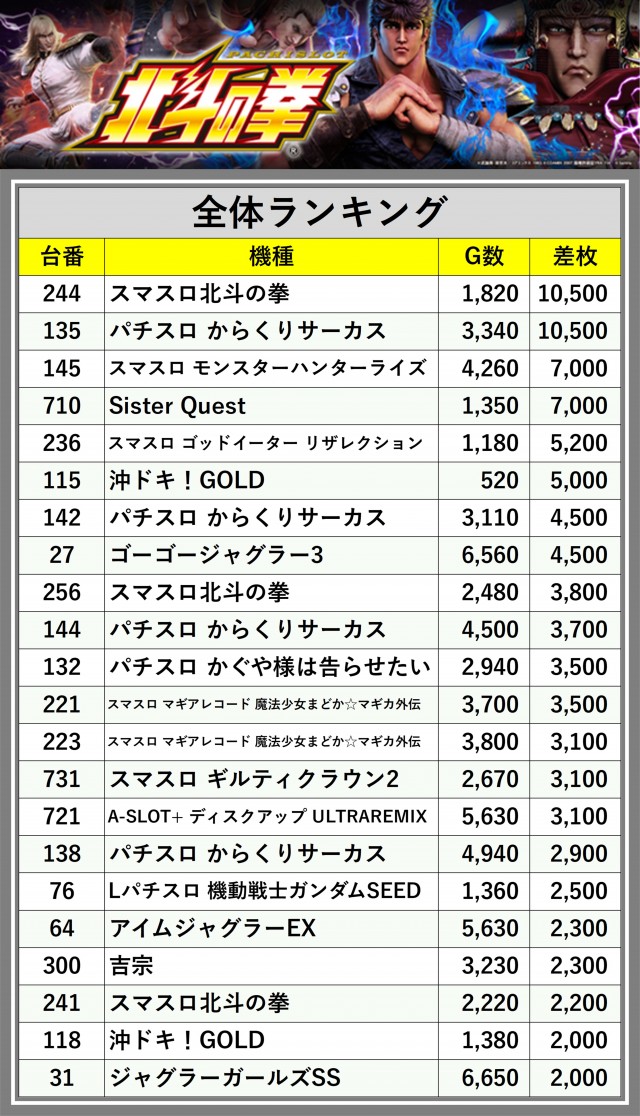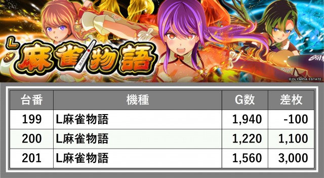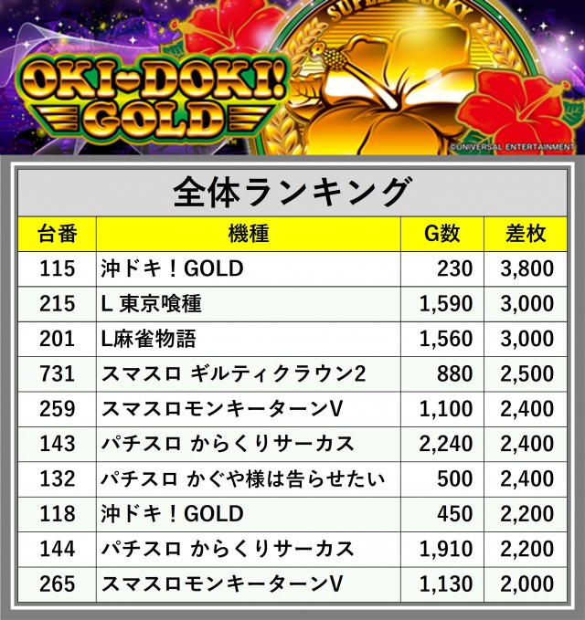 厳選された取材対象機種をはじめ、その他スロット全体から好記録が飛び出した!プレイヤーが楽しんだ1日を下記データにて振り返ってみて欲しい。