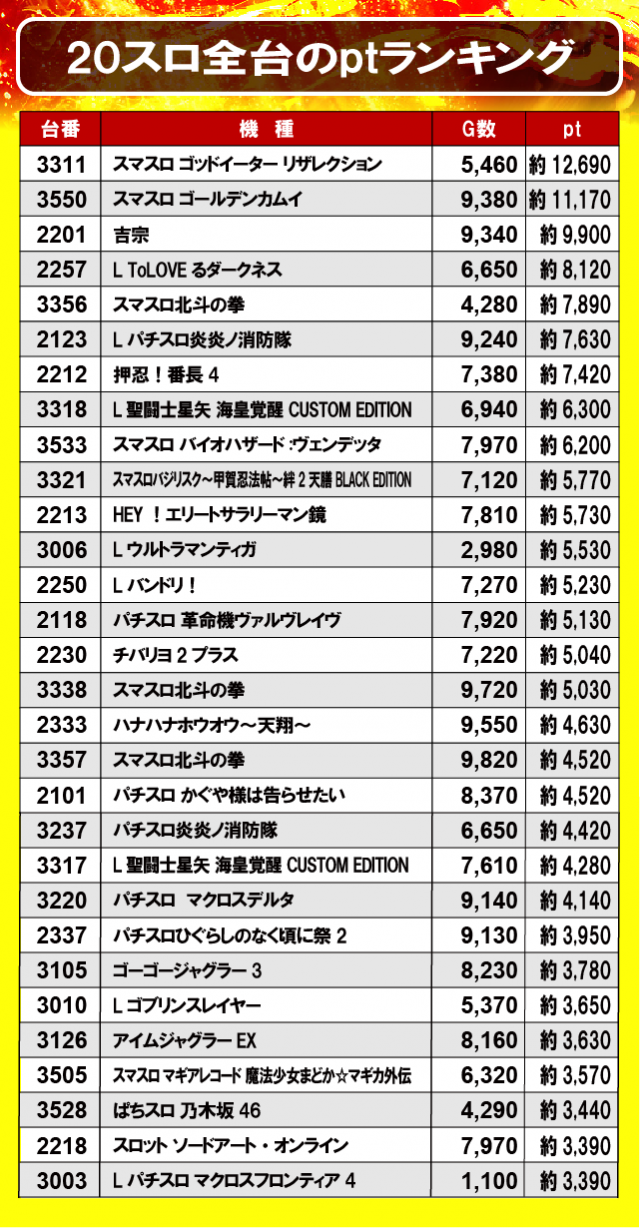 ①20スロ全台のptランキング