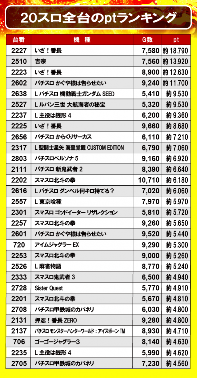 導入して間もない『いざ!番長』から約18,790ptという圧巻の数字が打ち立てられ、店内の盛り上がりを大きくリードしていた。さらに『吉宗』『パチスロ かぐや様は告らせたい』も万ptOVERと追随!そのほかにも『スマスロ北斗の拳』から万回転OVERが飛び出すなど、遊技していたファンは明らかな好感触を掴んでいたことだろう。