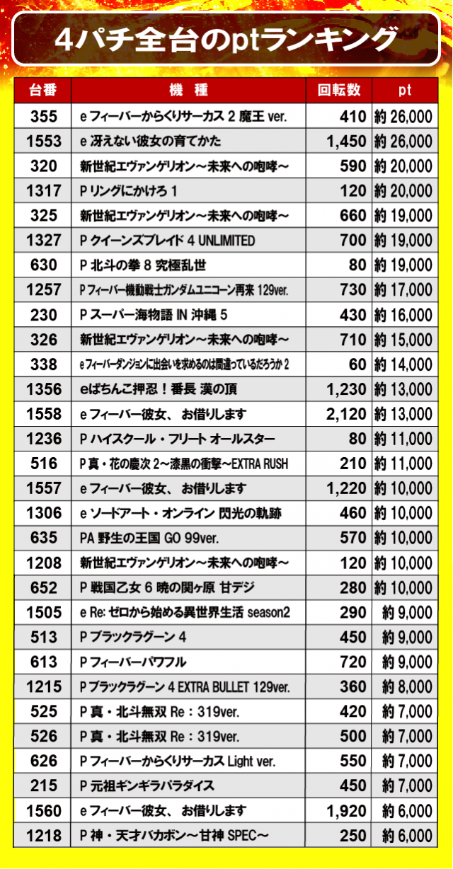 『eフィーバーからくりサーカス2 魔王ver.』と、新台『e冴えない彼女の育てかた』から約26,000ptをマーク!その他にも人気機種がズラリとランクインするなど、パチンココーナーでも盛り上がりを見せていた!