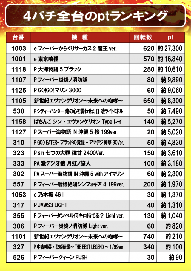 『eフィーバーからくりサーカス2 魔王ver.』から約27,300pt、『e 東京喰種』約16,840ptが生まれ大きな熱気を生み出している。また順調に大当りを積み重ねている台も確認でき、ファンは打ちごたえのある状況に歓喜していたはずだ。