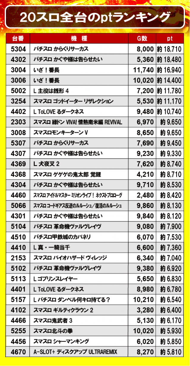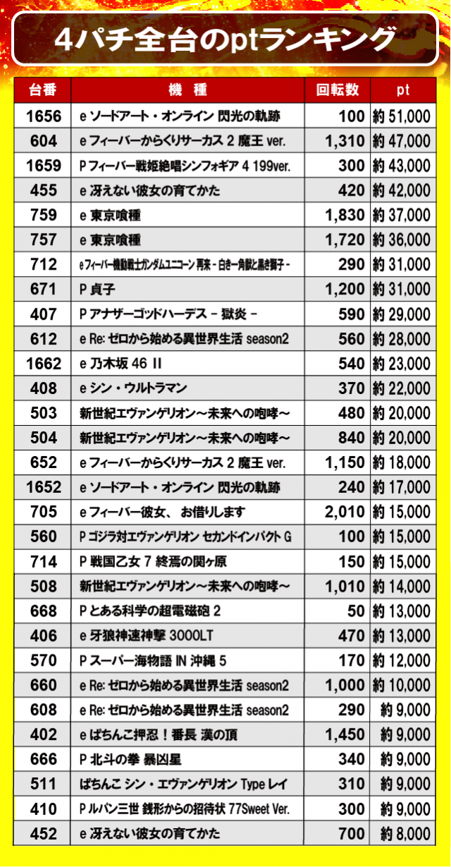 この日は万ptOVERが驚異の7台!『パチスロ からくりサーカス』と『パチスロ かぐや様は告らせたい』はコンプリート目前の約18,000ptOVERをマークし、店内は凄まじい熱気に包まれていたのが一目瞭然だ!その他にも万回転を記録する台もあり、ファンは打ちごたえのある状況に歓喜していたことだろう。