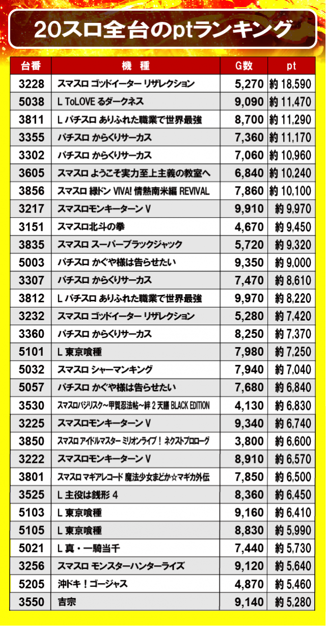 万ptOVERが驚きの7台!更にその中の1台は、約18,590ptという凄まじい結果に!また、ランキング上位30台は全て約5,000ptOVER!様々な機種が名を連ねており、店内全体を通して大きな熱気に包まれていたことが窺える。
