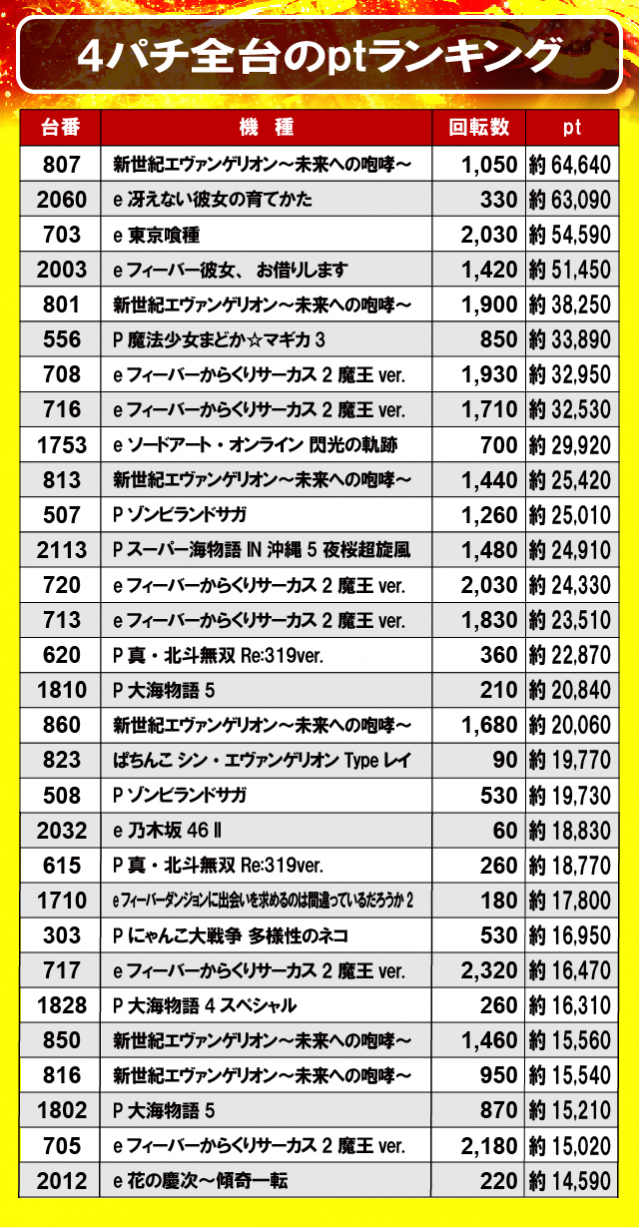 TOPは『新世紀エヴァンゲリオン〜未来への咆哮〜』で約64,640pt!『新世紀エヴァンゲリオン〜未来への咆哮〜』は、これ以外にも複数の台が良い結果を収めている。その他の機種では、『eフィーバーからくりサーカス2 魔王ver.』も同じく好調台が多く、これらの2機種に力を入れていたのは間違いなさそうだ。