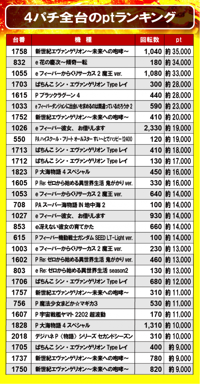『新世紀エヴァンゲリオン〜未来への咆哮〜』『e花の慶次〜傾奇一転』『eフィーバーからくりサーカス2 魔王ver.』から約30,000ptOVERをマーク!その他にも人気機種がズラリとランクインするなど、パチンココーナーでも盛り上がりを見せていた!