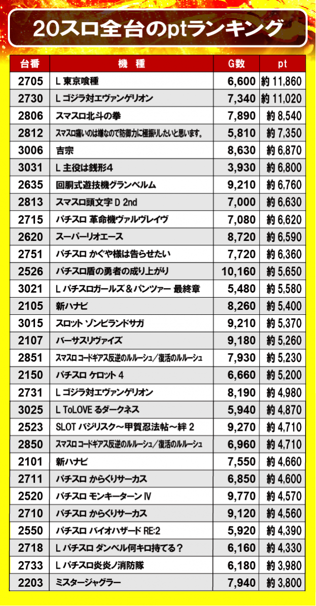 『L 東京喰種』と『L ゴジラ対エヴァンゲリオン』から万ptOVERが発生し、店内の活気と熱気を大いに引き上げてくれた。それらに続き『スマスロ北斗の拳』から+8,000ptOVER、『スマスロ痛いのは嫌なので防御力に極振りしたいと思います。』から+7,000ptOVERと大台突破台が多数生まれており、ファンにとっては笑顔が溢れる1日になったのは間違いない。