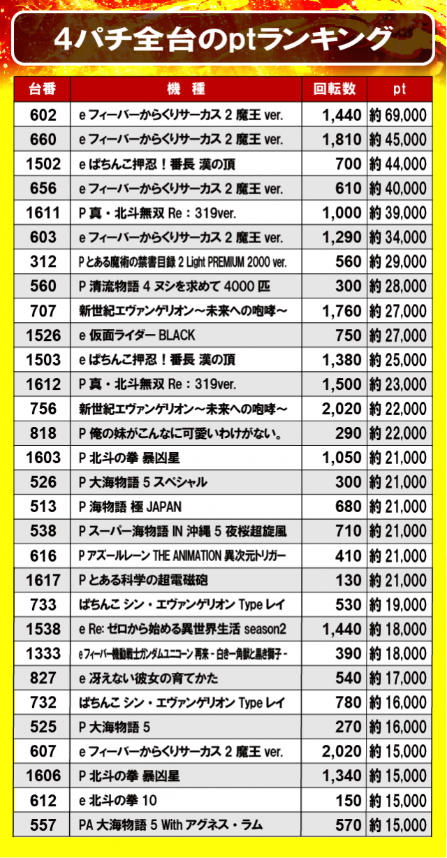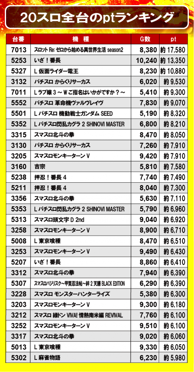 『スロット Re:ゼロから始める異世界生活 season2』『いざ!番長』『L 仮面ライダー電王』から3台の万ptOVERが生まれ、凄まじい熱気が放たれていた!また、20スロptランキング上位30台は約5,000ptOVERから名を連ねている点も、同店の高い実力を感じずにはいられない内容となっていた!