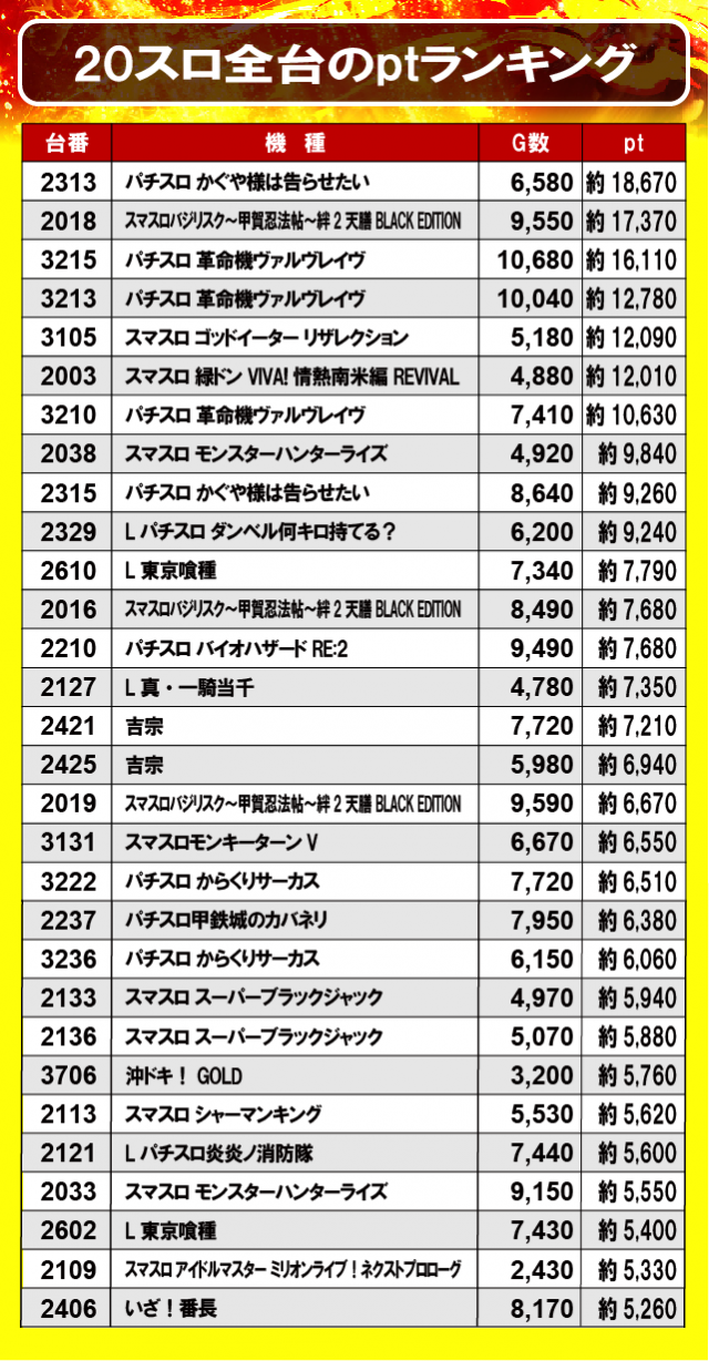 なんと万ptOVERが7台という脅威の結果!そして『パチスロ かぐや様は告らせたい』はコンプリート目前の約18,670ptをマークし、一際存在感を放っていた!他にも店内各所にポテンシャルを秘めた台が多く存在し、至る所にチャンスが隠されていたようだ。