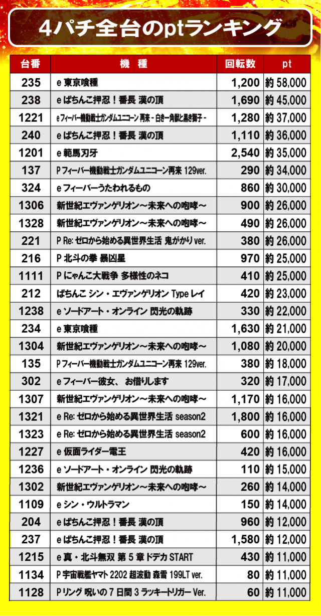 パチンココーナーも大きな活気に包まれており、閉店まで絶える様子はなかった。その中で『e 東京喰種』から約58,000pt、『eぱちんこ押忍!番長 漢の頂』から約45,000ptを記録するなど、大きな熱気が放たれていた!その他にも、まとまったptを確保する台もあり多くのファンから笑顔が溢れていた。