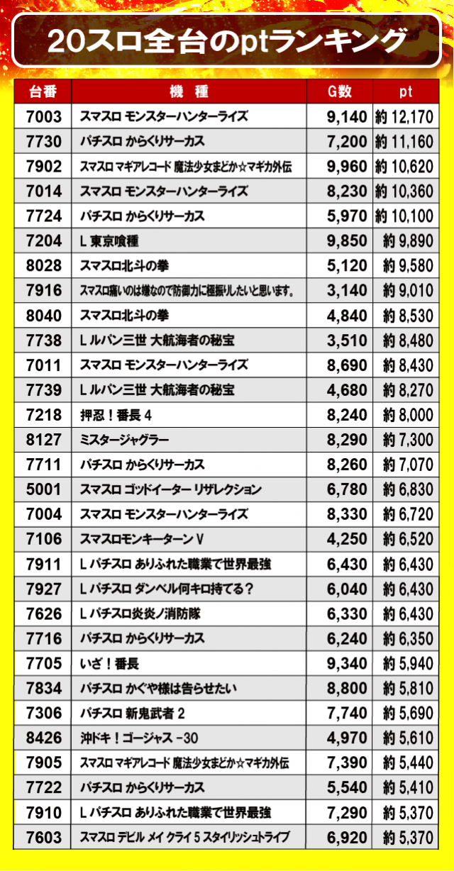 なんと万ptOVERが5台という脅威の結果!『スマスロ モンスターハンターライズ』と『パチスロ からくりサーカス』からは2台発生という大きな熱量が確認できた。新台『いざ!番長』『スマスロ デビル メイ クライ5 スタイリッシュトライブ』からもまとまったptをマークし、各所で打ちごたえのある状況が整っていたことが窺える。
