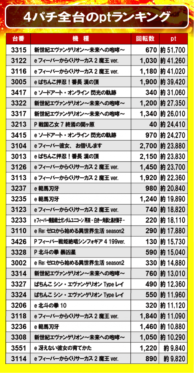 人気機種『新世紀エヴァンゲリオン〜未来への咆哮〜』は約51,700ptを獲得しており、一際存在感を放っていた。『eフィーバーからくりサーカス2 魔王ver.』も約41,260pt、約41,020ptと追随。いずれも上位30台は好成績を残す盛況ぶりで、パチンココーナーでも熱気が満ち溢れていたようだ!