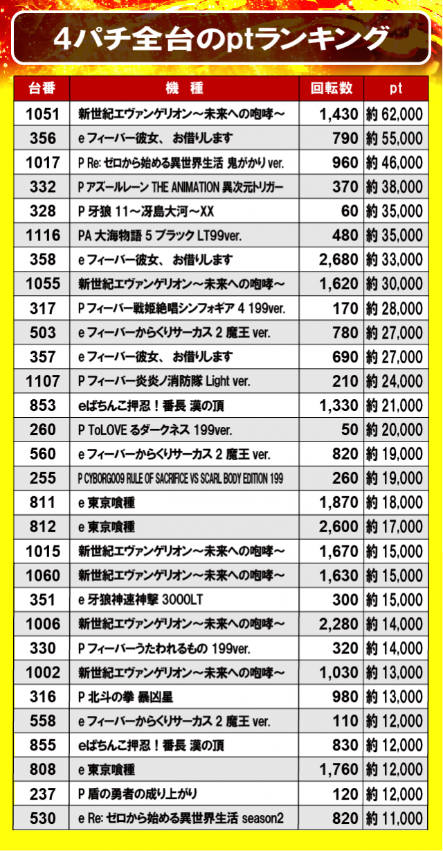 『新世紀エヴァンゲリオン〜未来への咆哮〜』から約62,000ptをマークし、一際存在感を放っていた。次いで新台『eフィーバー彼女、お借りします』から約55,000ptが生まれるなど好成績を残す盛況ぶりで、遊技していたファンは充実のひと時を過ごしていたことだろう。その他の機種も活躍しており、いずれも高い実力を発揮していたことから各所にチャンスは隠れていたようだ!