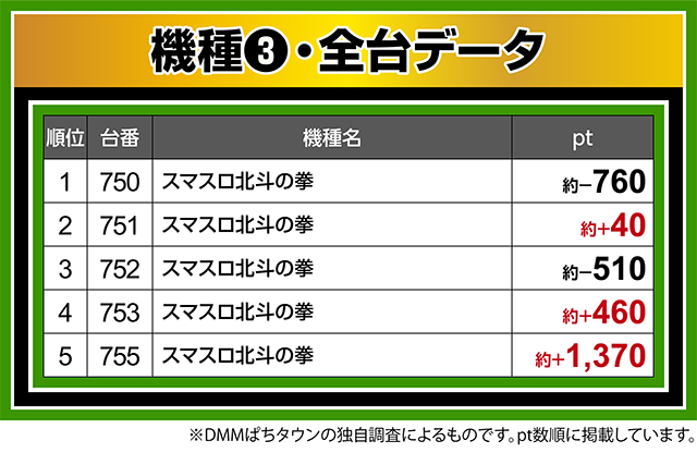 『スマスロ北斗の拳』も結果を残した台は多く、755番台が約+1,370pt。