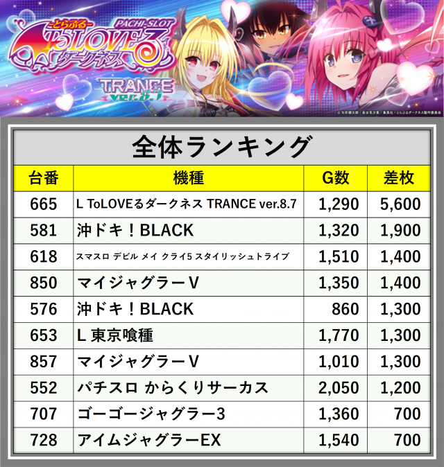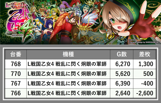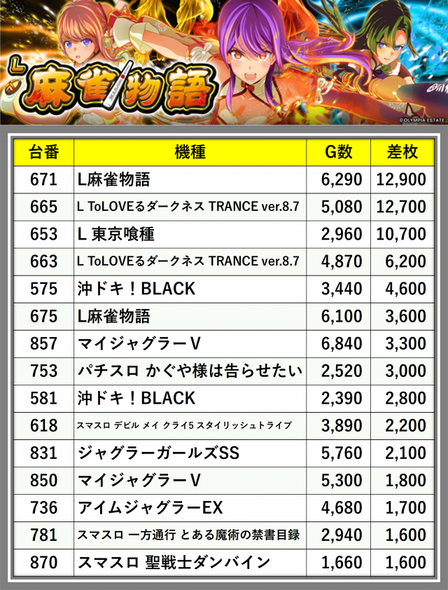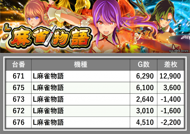 厳選された取材対象機種をはじめ、その他スロット全体から好記録が飛び出した!プレイヤーが楽しんだ1日を下記データにて振り返ってみて欲しい。