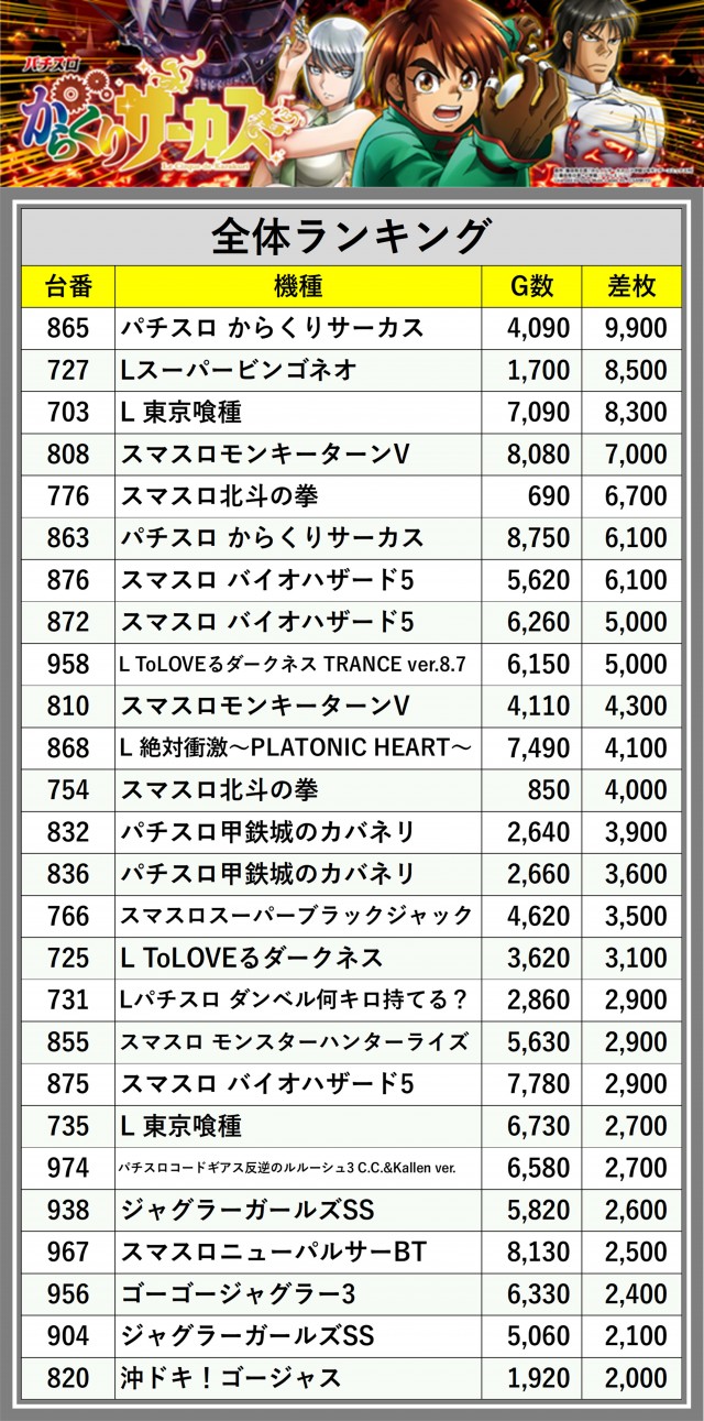 厳選された取材対象機種をはじめ、その他スロット全体から好記録が飛び出した!プレイヤーが楽しんだ1日を下記データにて振り返ってみて欲しい。