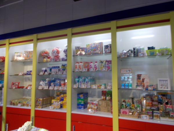 景品コーナーはお菓子・食品に加えて、子供向けのおもちゃも豊富。遊技を終えたプレイヤーは楽しく賞品を選んでいたことだろう。