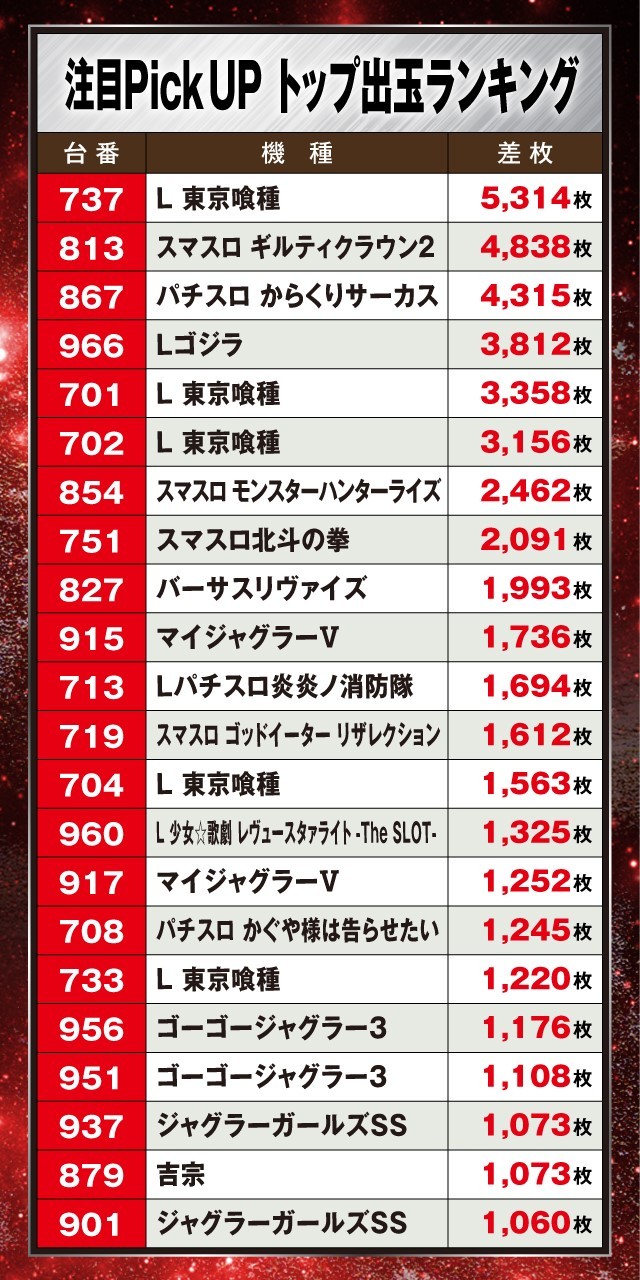 この日は、人気のスマスロを中心に多数の好調台が確認された。そんな中、最もプレイヤーの注目を集めていたのが『L 東京喰種』で、737番台の+5,314枚を筆頭にハイスコアが連発。最終的に差枚TOP20に5台がランクインする勢いを見せ店内を盛り上げていた。