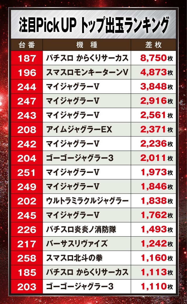 また、その他の機種ではジャグラーシリーズが大奮闘!! 『マイジャグラーⅤ』を筆頭に『アイムジャグラーEX』や『ゴーゴージャグラー3』、さらには『ウルトラミラクルジャグラー』から好成績が連発し、差枚TOP10に8台がランクインする盛況ぶりを見せている。