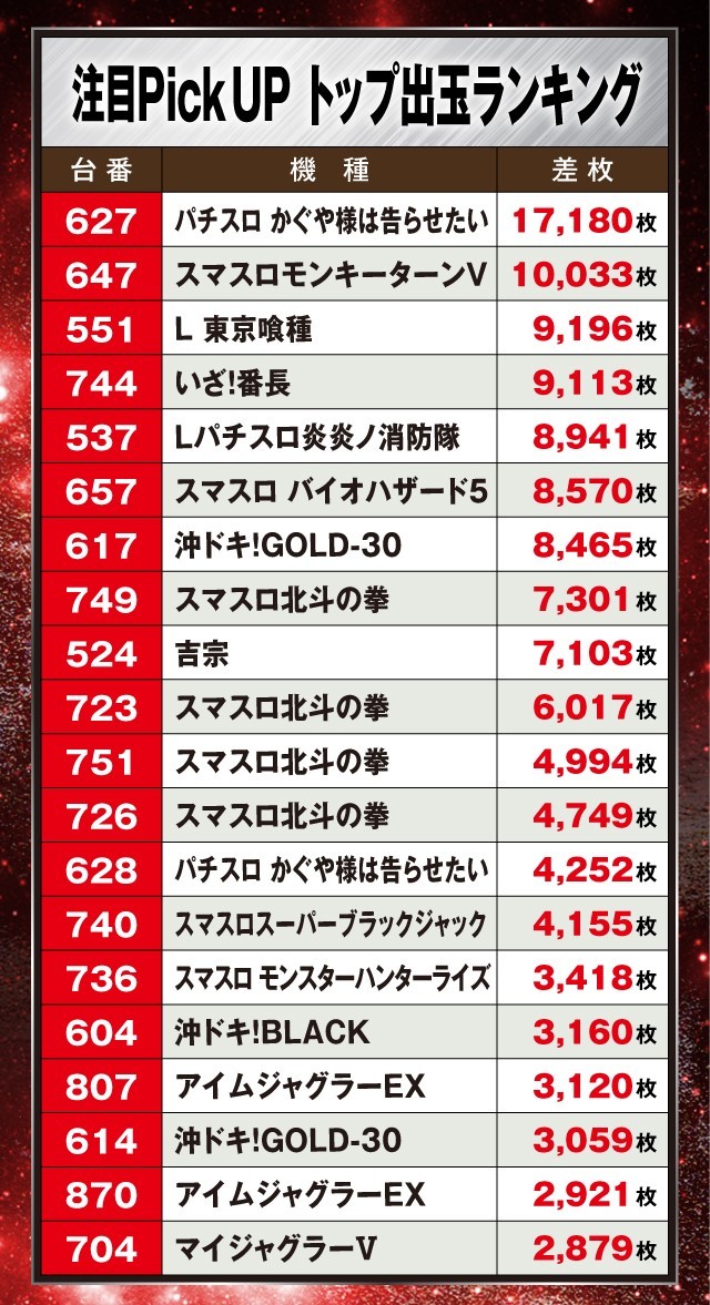 また、その他の機種では『L 東京喰種』と『いざ!番長』から+9,000枚超が発生。さらに、『スマスロ北斗の拳』からもハイスコアが連発しており、差枚TOP20に4台がランクインする勢いを見せファンを喜ばせていた。