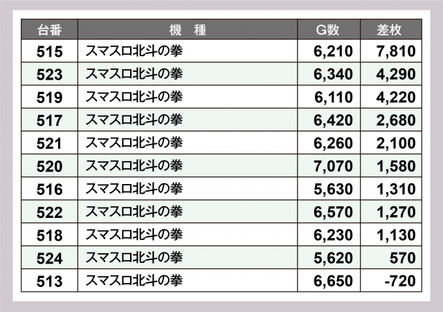 まずはパチスロ。『スマスロ北斗の拳』は極めて高い勝率を誇り、シマトップの台は+8,000枚近くまでに迫った。
