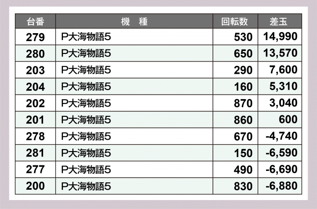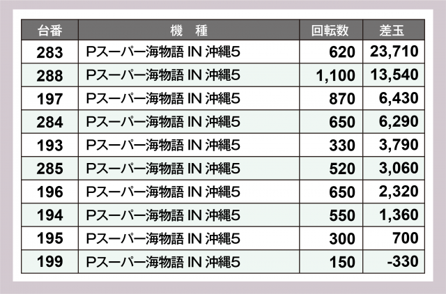 パチンコでは『P大海物語5』『Pスーパー海物語 IN 沖縄5』と海物語シリーズが実力を発揮。前者での最高値は+24,000発弱を計上した。