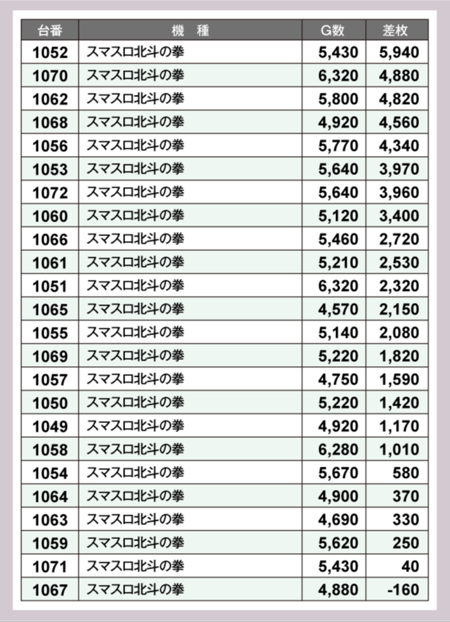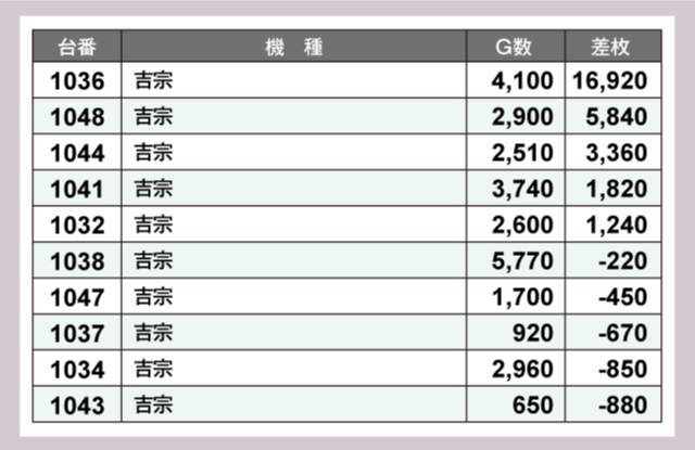 なかでもプレイヤーの注目を集めたのが『スマスロ北斗の拳』で、1052番台の+5,940枚を皮切りに全24台中23台がプラス差枚となる圧巻の結果を残した。また、『吉宗』からは怒涛の+16,920枚が確認されている。