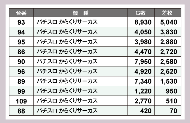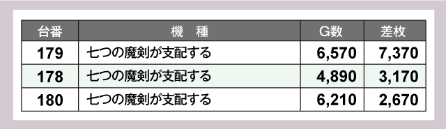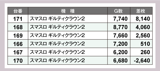 次に、その他の機種を見てみると『パチスロ からくりサーカス』が+5,040枚、『七つの魔剣が支配する』が+7,370枚を記録。さらに、導入直後の新台『スマスロ ギルティクラウン2』が+8,140枚を叩き出しプレイヤーの注目を集めていた。