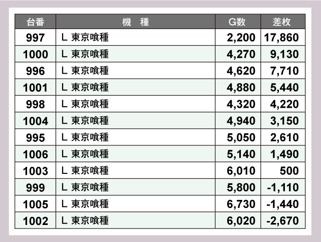 なかでもプレイヤーの注目を集めたのが『L 東京喰種』で、997番台が+17,860枚、1000番台が+9,130枚というハイスコアを記録。さらに、全12台中9台がプラス差枚となる圧巻の結果を残しているだけに、ファンとっては大満足の一日となったはずだ。